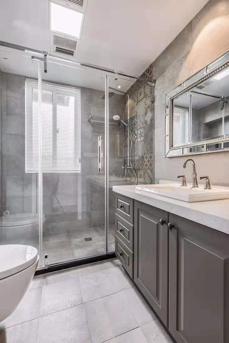 主衛(wèi)設(shè)置了淋浴隔斷,灰色的衛(wèi)浴柜搭配白色的臺(tái)面,低調(diào)簡潔。