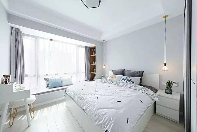對(duì)于面積稍大的臥室,除了擺放床,床頭柜之外,可以把其中一個(gè)床頭柜撤掉,放梳妝臺(tái),倘若面積足夠大的,仍然可以保留床頭柜;